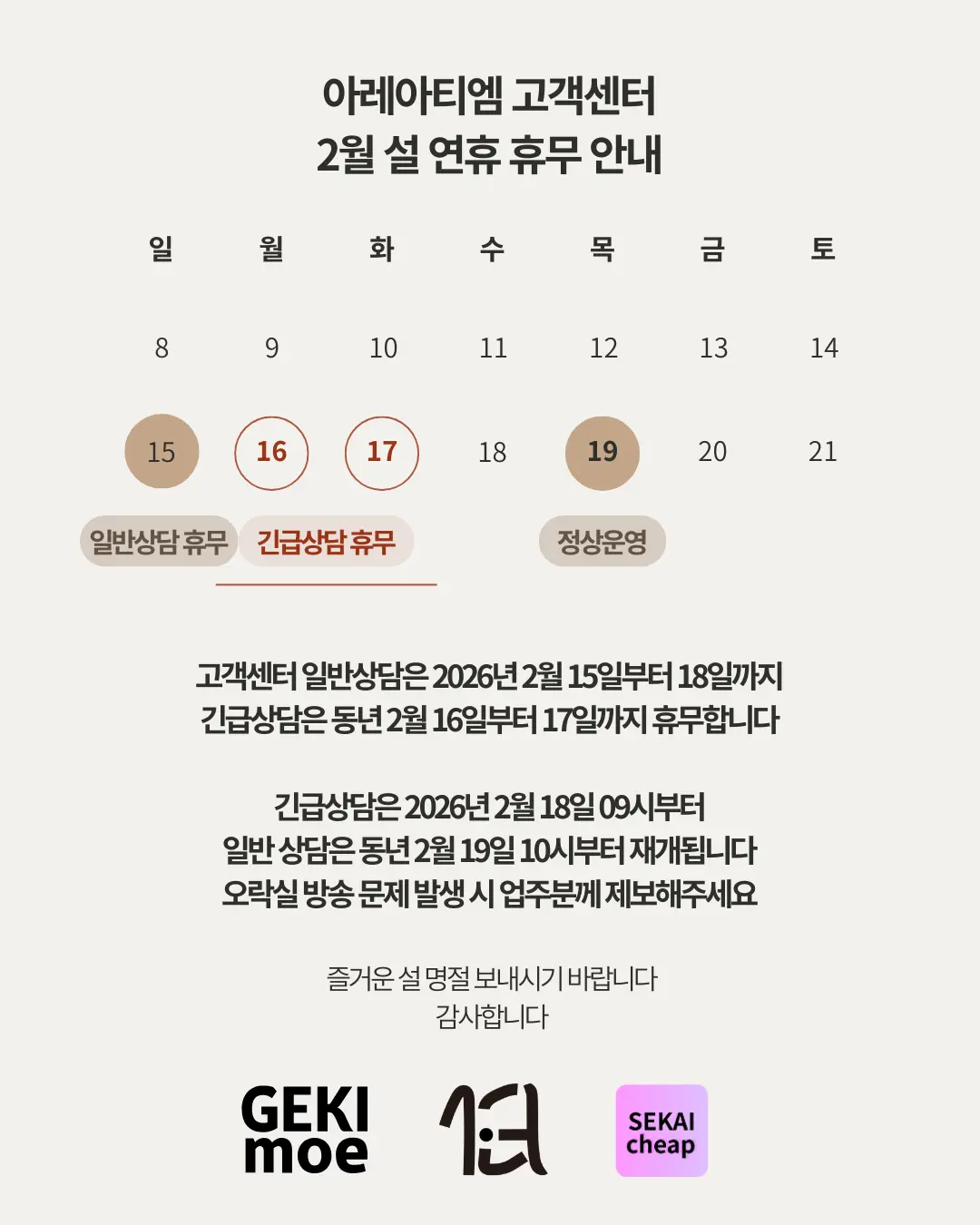 2026년 설 명절 인사 및 휴무 안내 (26.2.13)